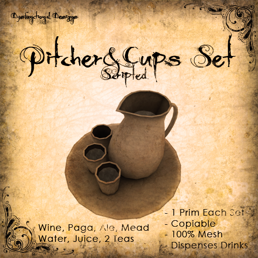 1 prim & scripted : Owner sets one of 8 drinks in it, and anyone who touches can receive a stone cup to drink. It is unlimited cups. Paga, wine, 2 types of tea, water, mead, ale, & juice. It is 100% mesh! Please come test it out and get a cup inworld š