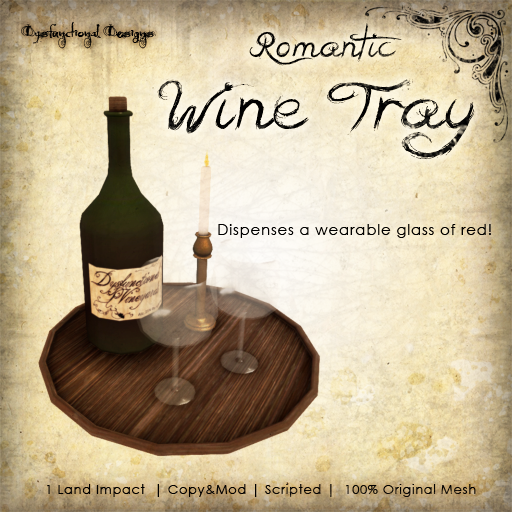 A deliciously dysfunctional glass of wine~ Posted on January 7, 2014 /Under Uncategorized A new release, out for 25L$ Tuesdays! Regularly to be priced at 95L$, only 25L$ today and until 11:59pm tonight (Tuesday!) 1 land impact, copy & mod, scripted to give a sippable glass~ Visit the store & follow the green arrows to grab it today! Share this: Click to share on Facebook (Opens in new window) Facebook Click to share on X (Opens in new window) X
