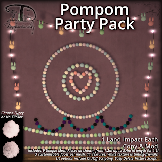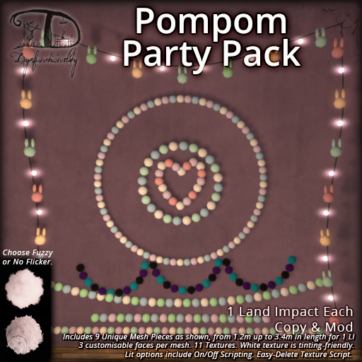 A silly pack of realistically fuzzy pompoms on strings or in shapes~ You’ll get 9 unique, all-original meshes with 3 faces each, and 11 textures to choose from – white being very tintable!