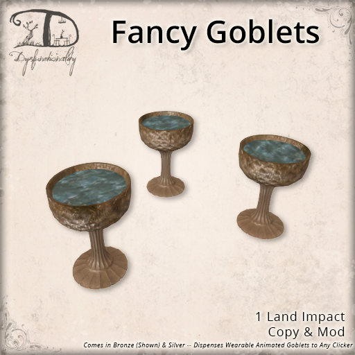 A simple fancy Tuesday Posted on April 12, 2016 /Under Uncategorized Happy 25L$ Tuesday~ Just a simple round this time. You can stop by and collect this trio of Fancy Goblets in either Silver or Bronze (shown)~ Dispenses a wearable version to your guests! Visit the main store now. ♥ Share this: Click to share on Facebook (Opens in new window) Facebook Click to share on X (Opens in new window) X