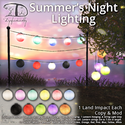 Each are just 1 land impact, and on those with lanterns have an option for one of 11 texture change choices, including traditional reds, as well as soft pastels.