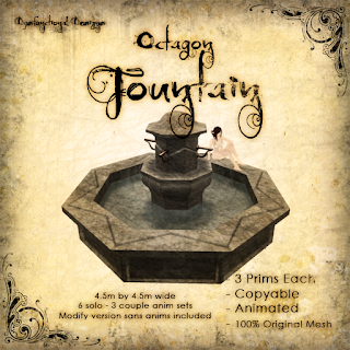 This fountain includes a copyable but no mod version with animations (6 solo, 3 couple) and a modify and copyable version with no animations or scripting. It’ll set you back a mere 275L$ for both versions.