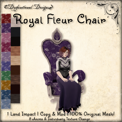 We’ve decided to offer up this Royal Fleur Chair with 8 very Princessy animations, oodles of texture options, and an amazingly meager 1 land impact!