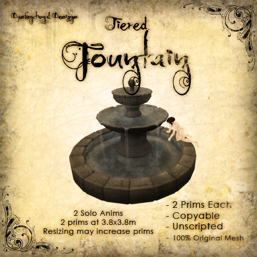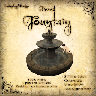 As well, a classically designed Tiered Fountain is now available, also coming in at a miniscule 2 prims for a big and beautiful presence, this piece includes 2 animations for idling on the side, or a non animated but modifyable version for those with more ambitious dreams.