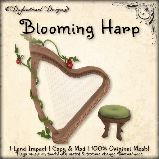 The first one is our Blooming Harp! Only 1 land impact with detachable stool, it plays a soft melody by menu click from the owner. It also is texture change with several base choices (metal and woods) as well as many flower options!