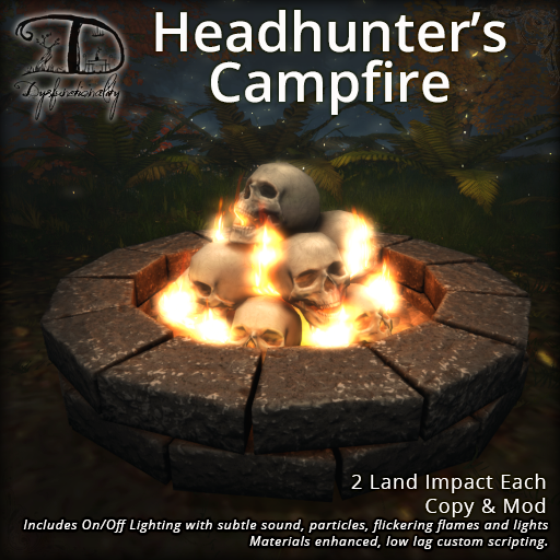 Our Headhunter’s Campfire is an all-new and original mesh with on-off scripted lighting with realistic subtle sound, flickering lights, particle embers, and more.