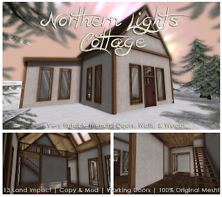 The Garden : January 2014 : Northern Lights Cottage Posted on January 15, 2014 /Under Uncategorized This cottage was based on many examples of beautiful homes of Northern Europe where it is common to see structures made of predominantly glass, with lots of windows for viewing the gorgeous Aurora Borealis / Northern Lights! Designed to match the theme of this months TLC “The Garden!” The Northern Lights Cottage features an upstairs loft, Living room, proper smaller first floor bedroom, and a semi-open room to the opposite side connected to the large ‘hallway’ where the stairwell is located. As well, there is tons of windows on the walls & ceiling windows! Each part of this home is easily tintable using just the tools SL provided, and many of them would be fine if you applied your own regular textures as well. The doors are “Kool Door” ready, enabling you to upgrade them with the Kool Door RP door kit available from Kool Mekanic, but will function fine as basic doors for normal users as well. At only 13 land impact, 100% original mesh & with a removable unique fireplace, copy & mod & 425L$ we hope you’ll love this cottage! Only available at The Liaison Collaborative “The Garden” until late February~ Here are some bonus pics taken by Kalia Firelyte, the builder of the home, to showcase the tinting abilities! Share this: Click to share on Facebook (Opens in new window) Facebook Click to share on X (Opens in new window) X